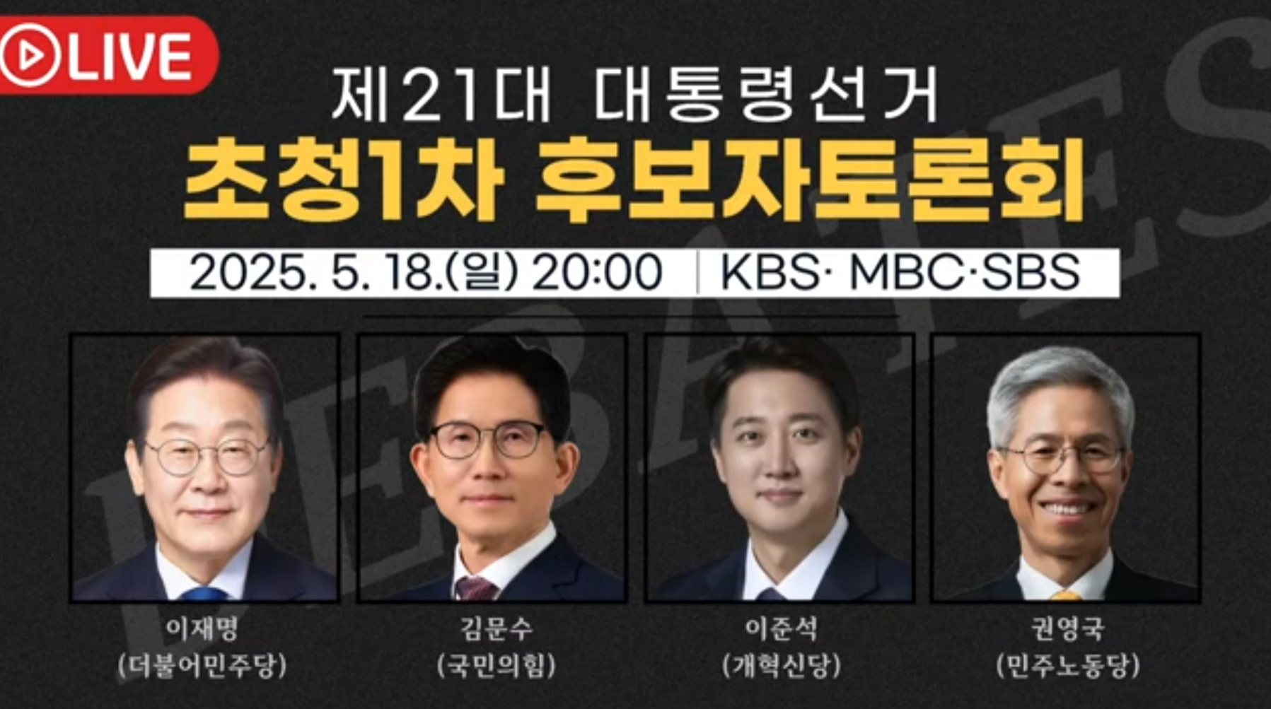 | 1차 | 5월 18일(토) | 20:00 | 경제 (저성장, 민생경제, 통상) | 이재명, 김문수, 이준석, 권영국 |