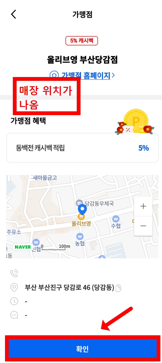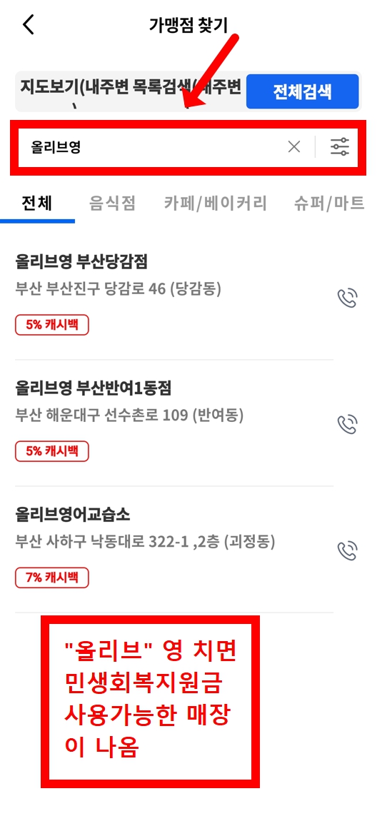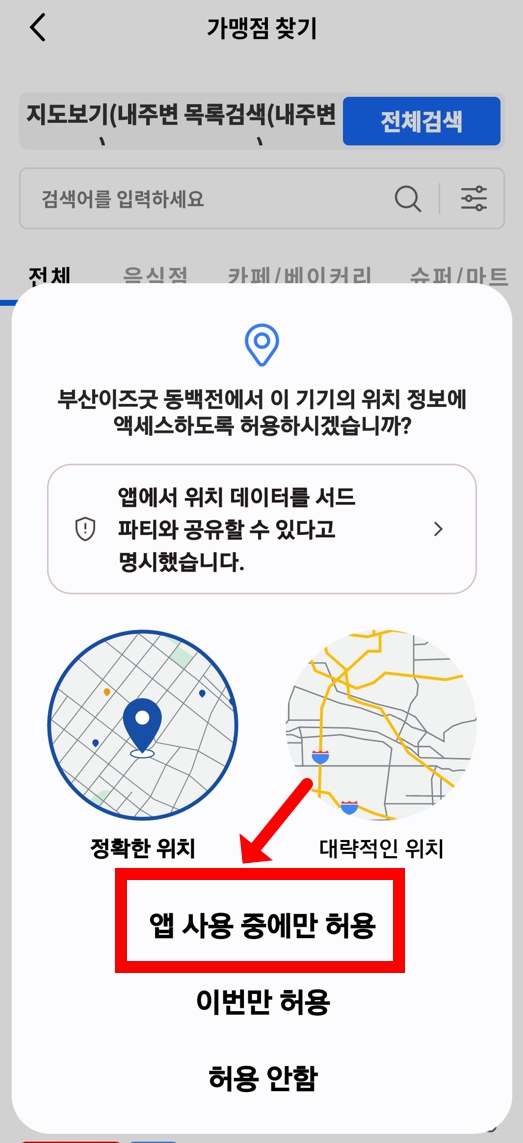 - 지도에서 내 주변 가맹점을 확인하거나, 상단 검색창에 가게 이름을 직접 검색합니다. 이 방법이 100% 가장 정확합니다!