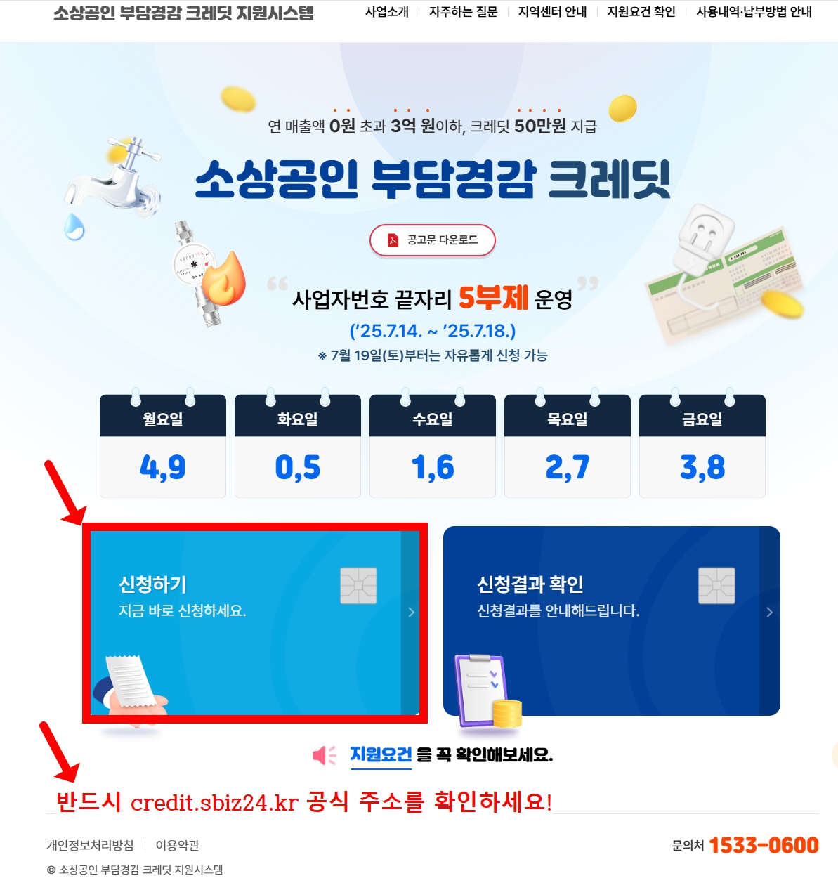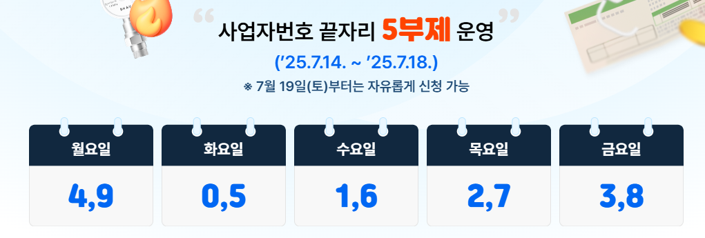 오늘 신청 못 하셨어도 괜찮아요! 신청 첫 주(7/14~18)는 사람이 몰릴까 봐 5부제로 신청받고 있어요. 오늘은 사업자등록번호 끝자리가 '4, 9'인 분들의 차례였답니다. 내일은 누구 차례일까요?