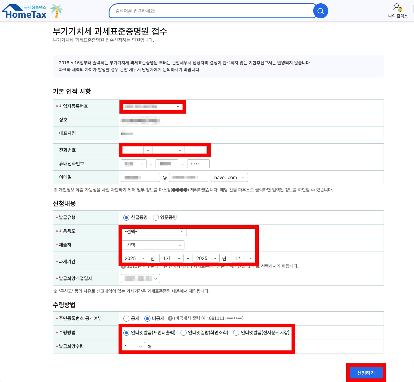 - 수령 방법: 주민등록번호 공개 여부, 수령 방법(인터넷발급-프린터출력), 발급 희망 수량을 선택합니다.
