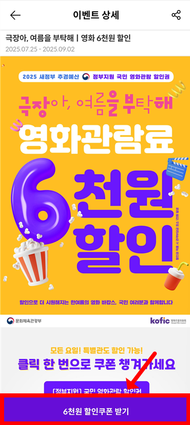 - '영화 6천원 할인권' 상세 페이지에서 [쿠폰 받기] 버튼을 누릅니다.