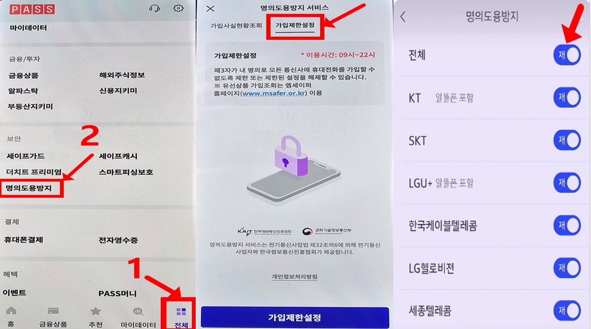 - 방법: PASS 앱 → 메뉴 → "명의도용 방지 서비스" → "가입 제한 설정" → 전체 통신사 차단 설정.