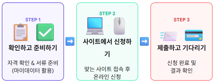- 신청이 완료되면 결과 발표를 기다리세요. 선정 후에는 안내에 따라 전용 카드 발급 등의 절차를 진행하면 됩니다.