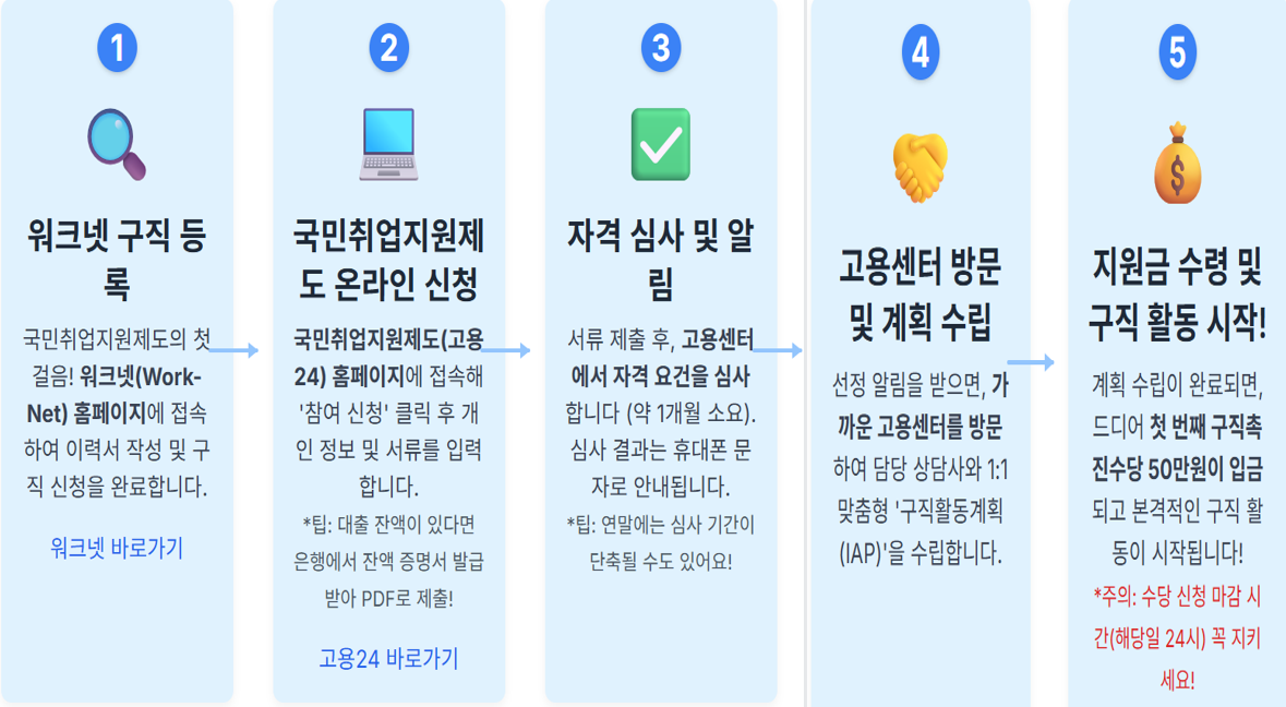 - 계획 수립이 완료되면, 드디어 첫 번째 구직촉진수당(50만원)을 받고 본격적인 구직 활동을 시작합니다!