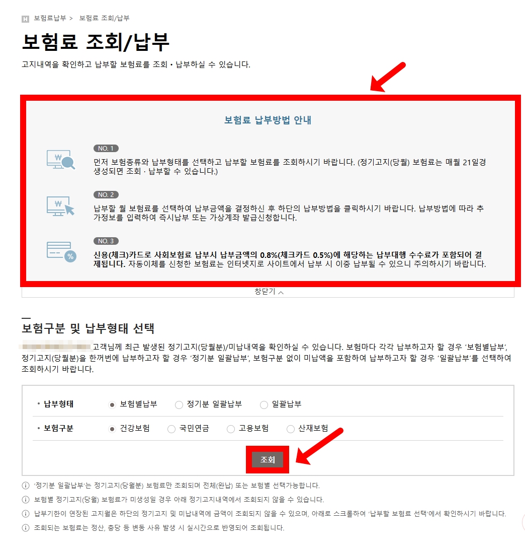 - 납부할 보험료를 [조회] 후 [납부하기] 버튼을 누릅니다.